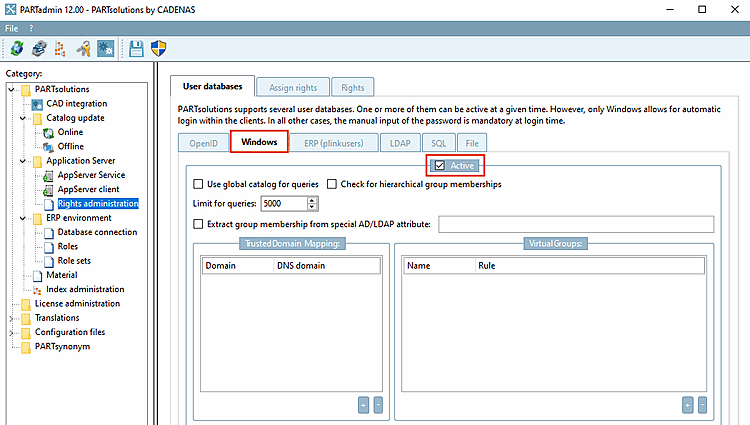 As soon as the Active option is activated on the Windows tab page under PARTadmin -> Rights management [Rights administration] category -> User databases tab page, a user-related login can be carried out.