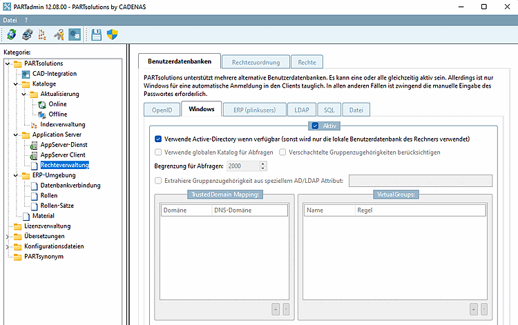 In general, all Windows users and groups can be displayed under PARTadmin -> Rights management [Rights administration] category -> User databases tab page on the Windows tab page. As a rule, the PARTadmin module is only available to the administration and access to GDPR-relevant files is regulated via the Windows rights management.
