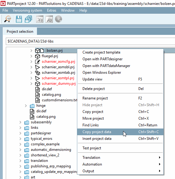 Select the desired target project and execute the context menu command Insert project data (alternatively Ctrl+Shift+V).