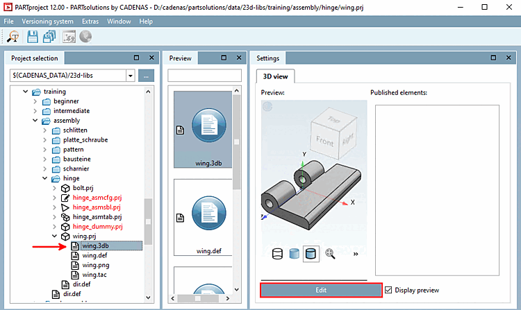 PARTdesigner is called up in PARTproject after selecting the desired file under Project selection and then either via context menu command or in the Settings docking window by clicking on the button.