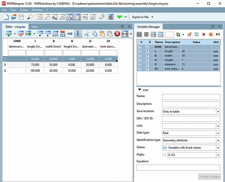 PARTdesigner opens with the docking windows Table and Variable manager [Variable Manager].