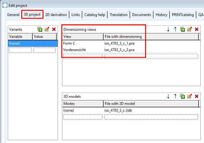 The entry of dimensioning views [Dimensioning views] is optional. These are displayed in the PARTdataManager under Technical views. Optionally, you can use the Variants dialog area if you want to assign specific dimensioning views [Dimensioning views] to different variable values (table rows). | |