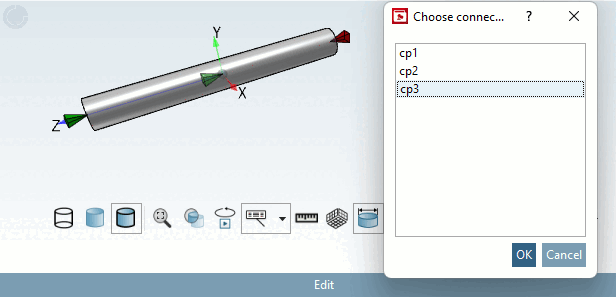 By selecting a connection point in the dialog (left), it is highlighted in red in the 3D view (right).