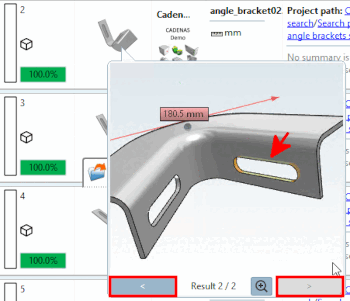 The partial search [Partial search] is a geometric search, but here you do not select components as a reference for the search, but individual features such as planes, cylinders, etc. and use them to find all components that contain these features. The geometric arrangement of the features is also used for the search.[35]