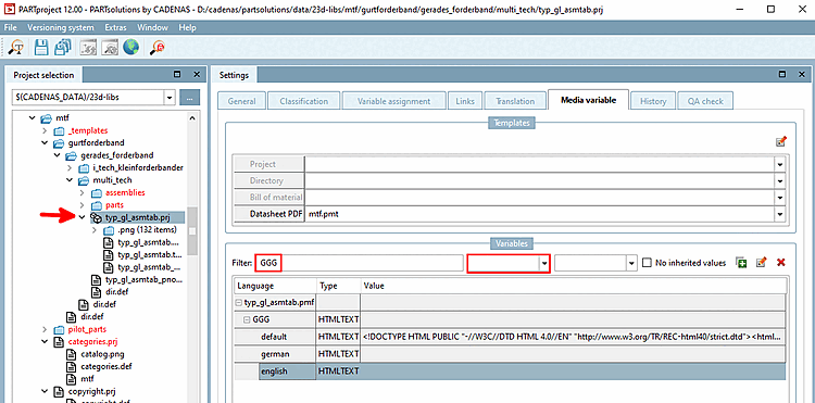 The translation in the Media Editor [Media editor] is useful if media variables are created for a PDF data sheet [PDF datasheet], as you call up the Media Editor [Media editor] directly from the PARTtemplate Designer. You can do this at Section 8.7, “Translate Media Variables”.