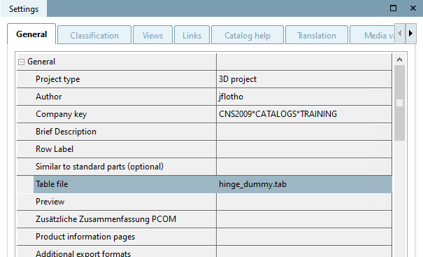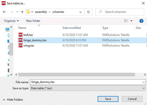 In PARTproject make sure that the file "scharnier_dummy.tab" is selected in your newly created directory under Settings -> General --> Table file in the list field.