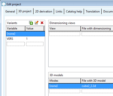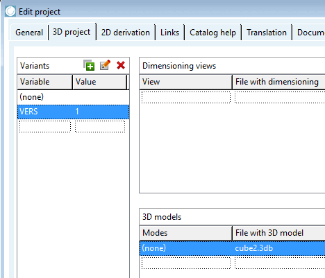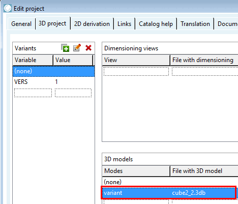 If there is a 3D model assignment for the variant (none) in the Variants dialog area, this variant is used as a "fallback" for all cases in which variants (in the example below "VERS=2") are not assigned a model.