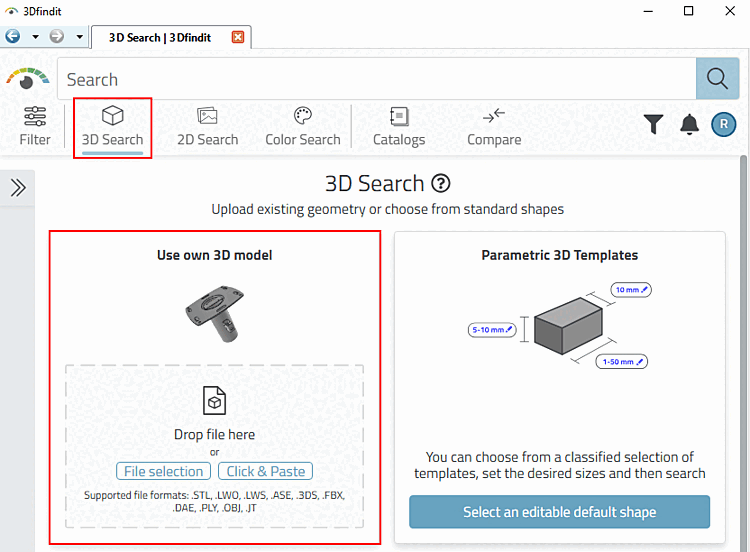 Alternatively, you can also upload 3D models by first clicking on the 3D Form [3D Shape] button in the main bar and then on the My 3D models [Own 3D models] dialog area. Select the desired model in the explorer window or simply drag the desired file into the dialog area.