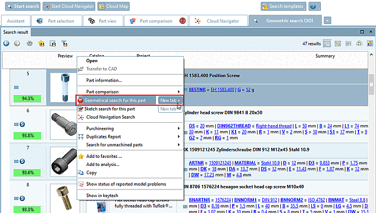 You can start a geometric search using the context menu command Geometric search for this part [Geometrical search for this part] of each result part. It is then also listed under History.