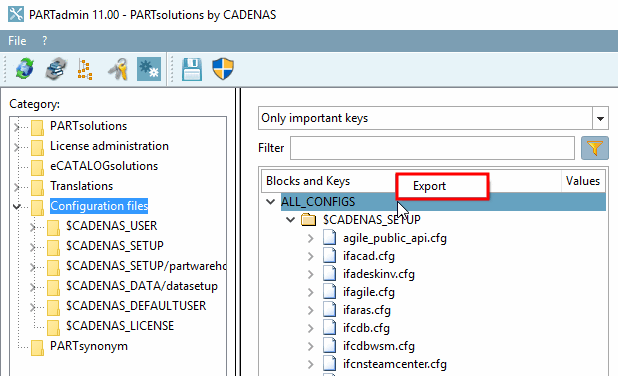 The Export context menu command is displayed in the ALL CONFIGS root node, at directory level and at configuration file level. This allows you to export the content of the selected branch to a text file.