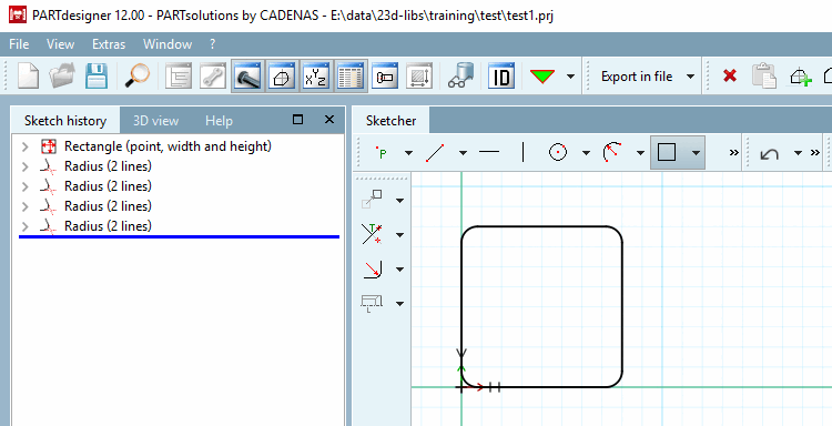 -> The individual rounding elements are also created in the sketch history [Sketch history]. They correspond to those created with the function Fillet to 2 elements [Radius with 2 elements]
