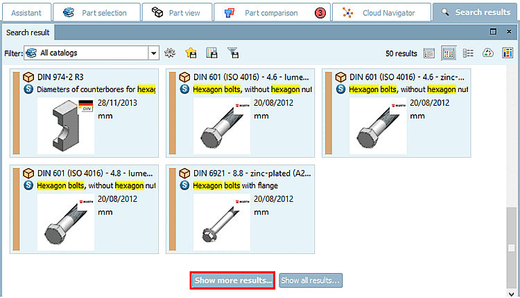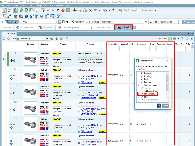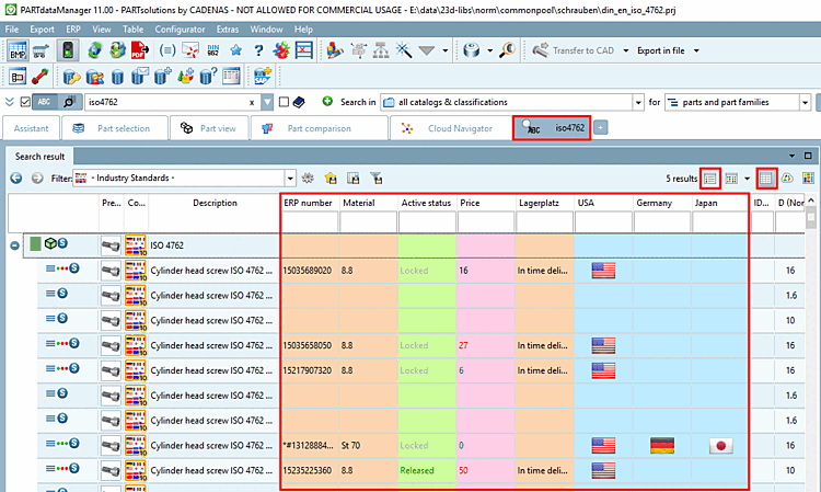 [1] Column colors and value colors (possibly depending on the value), etc. can be set administratively. See Section 4.9, “Table layout for PARTdataManager/3Dfindit and (PARTlinkManager) ”.