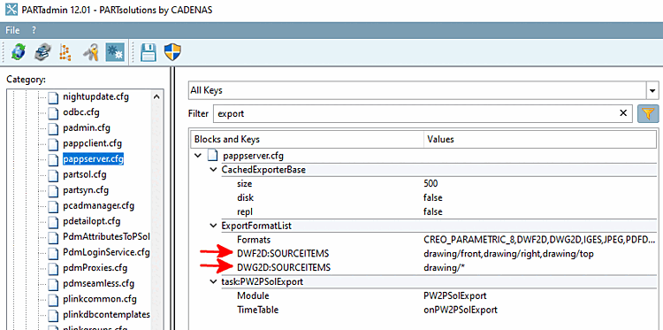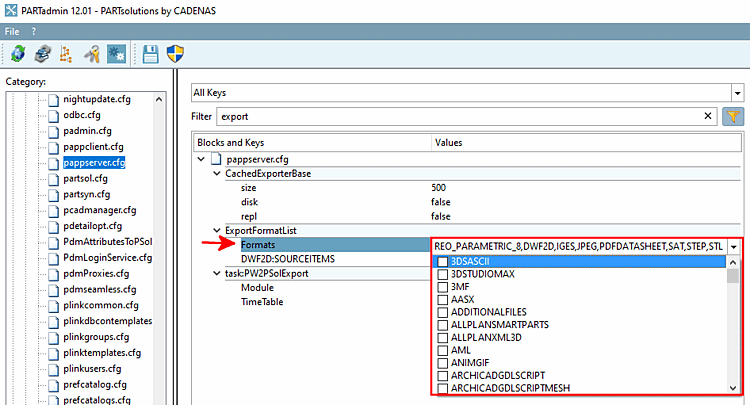 1. In PARTadmin , under $CADENAS_SETUP, select the pappserver.cfg configuration file and filter by "Export".