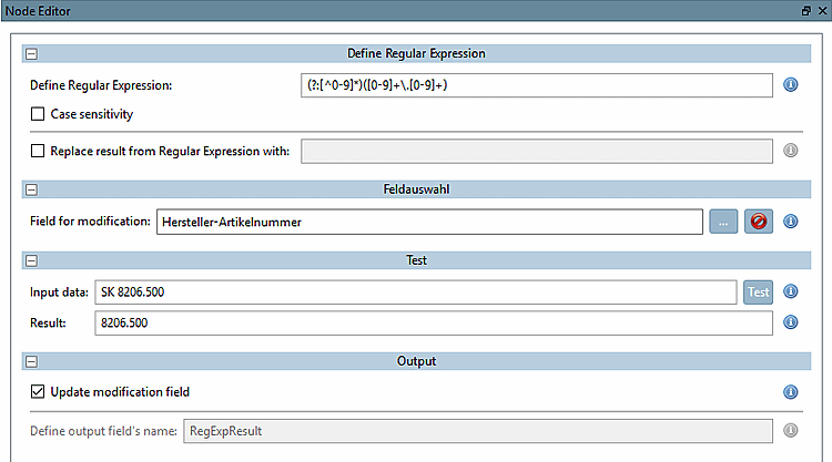 Field selection -> Field for modification: Determine the field to be modified. Here in the example "Manufacturer article number".