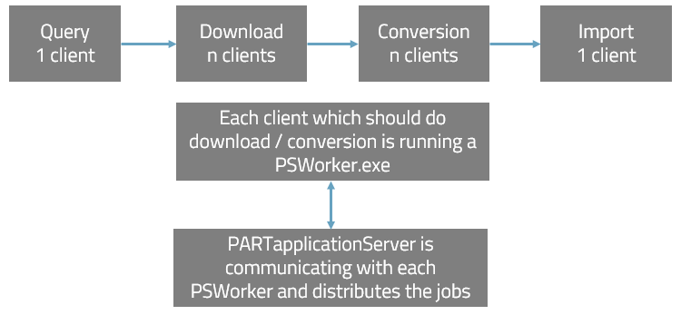 You can distribute the download and conversion service to multiple machines. Query and import service are not distributed. The PARTapplicationServer distributes the jobs to the desired clients.
