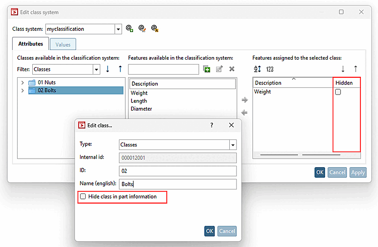 $CADENAS_DATA/datasetup/classsystem.cfgin the file stored. Hidden class systems are displayed on the Classification tab page is no longer available for selection. If the class system is hidden, it is also displayed in the partial information omitted. This can be done via the checkbox Class System in Part Information show. [Show class system in part information]Through the two setting options Classes Hide [Classes hideable] and Characteristics Hide [Attributes hideable] can also be used hide individual elements individually. Are these settings actively you get an additional column with the Selection box to hide and edit in the class... [Edit class...] windows nor the Selection to hide. Linked variables that are hidden are