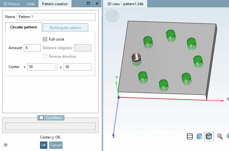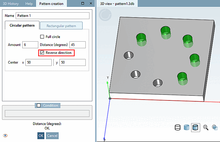 The pattern wizard makes it easy to create, edit and delete circular [Circular Pattern] and rectangular [Rectangular pattern] patterns. It is also compatible with older versions, as no new features are used.