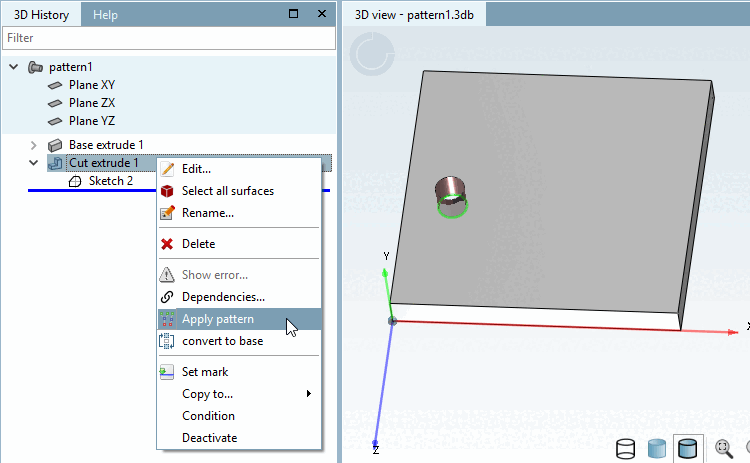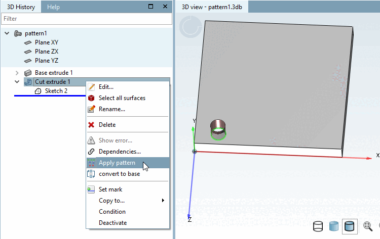 The call is made on Base extrude or Cut extrude via the context menu command Patterns [Apply pattern].