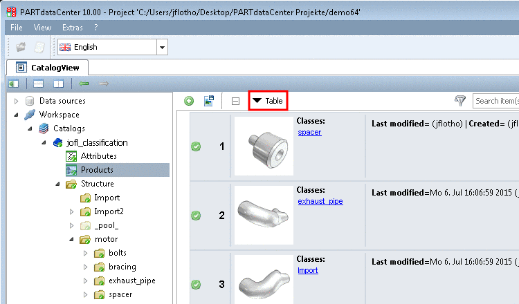 At display type Table, all attribute names are listed in one single field one after another. Furthermore you can conduct a textual search over all products here. Top-right the total number of products is shown.