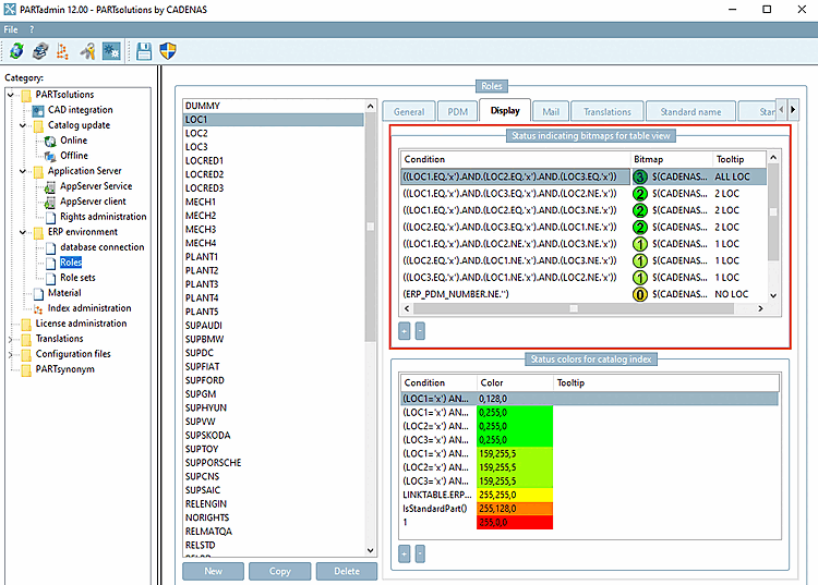 Setting in the user interface under PARTadmin -> Category Roles -> Display tab -> Status colors for table [Status indicating bitmaps for table view] dialog area: