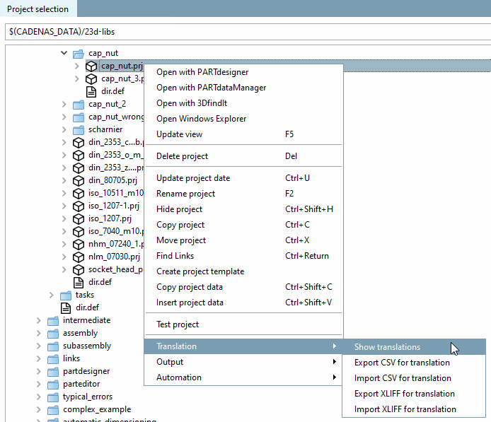 Click on the context menu command Show translations to list all translations of the selected directory or project in the Compare files [compare files] dialog box.