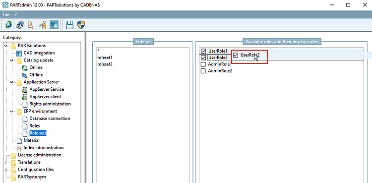 At least one role is assigned to each role set [Role set] in PARTadmin in the dialog area Available roles and their display sequence [Available roles and their display order].