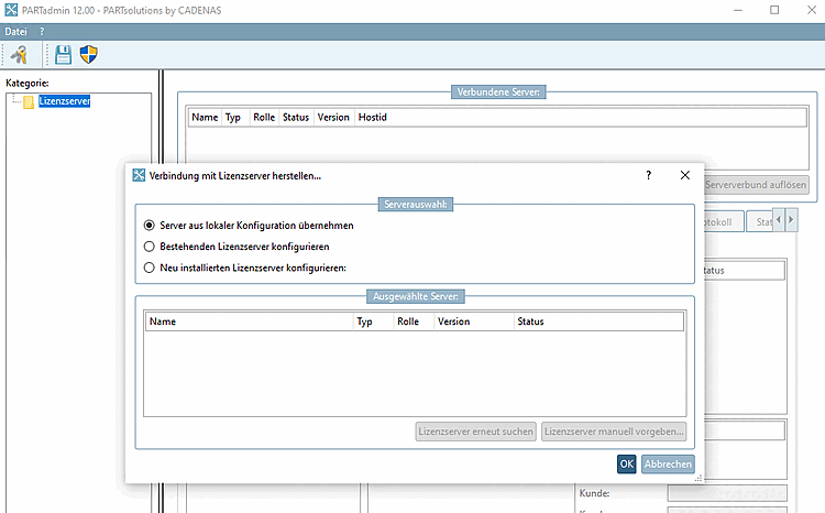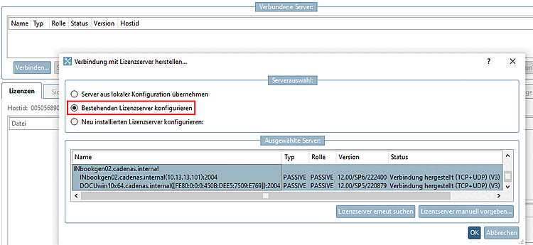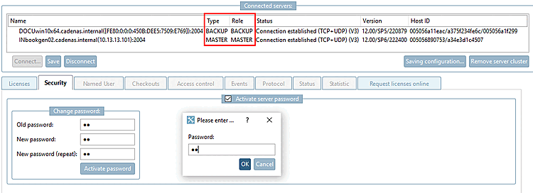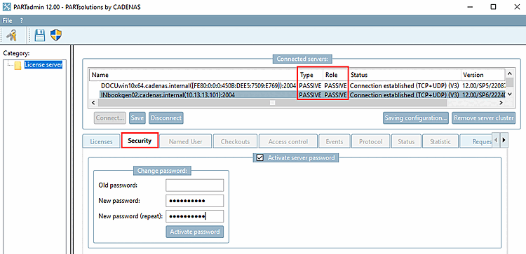 The selected license servers are displayed in the Connected servers dialog area (type and role still set to PASSIVE).