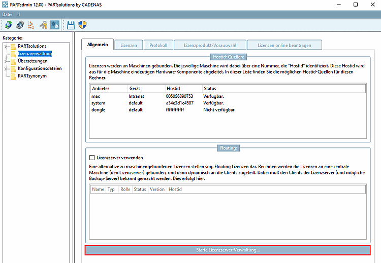 Open the license server administration from any client by clicking on the Start license server administration [Start license server management...]... button.