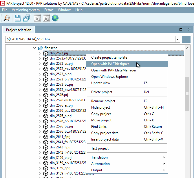 Open with PARTdesigner: [Open with PARTdesigner] PARTdesigner can be opened directly from the context menu of a project.