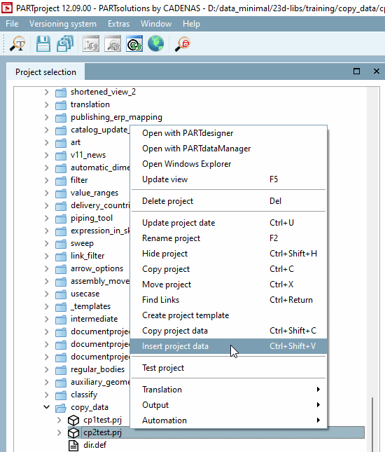 Select the desired target project and execute the context menu command Insert project data (alternatively Ctrl+Shift+V).