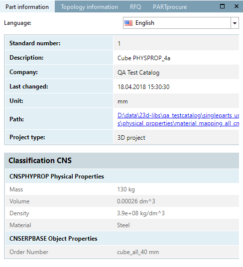 In the PARTdataManager the attributes of the CNS classification are displayed in the index tree, in the context menu of a part under the menu item Part information.