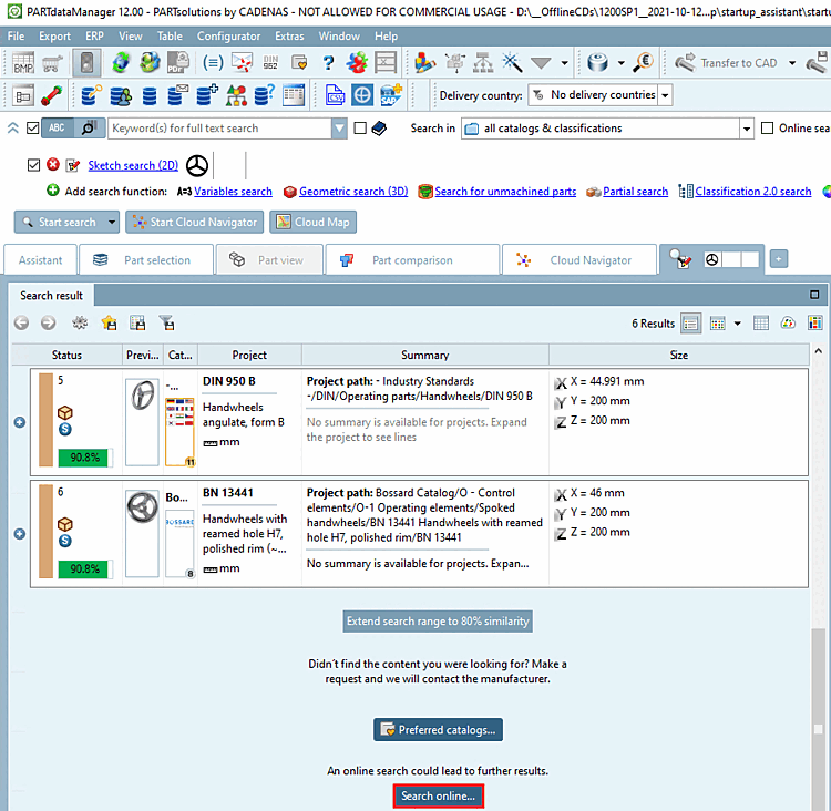External results can be opened, but all actions such as transfer to CAD, etc. are deactivated. If corresponding parts are to be used, either download the corresponding part from the portal or install the corresponding catalog locally via PARTadmin.