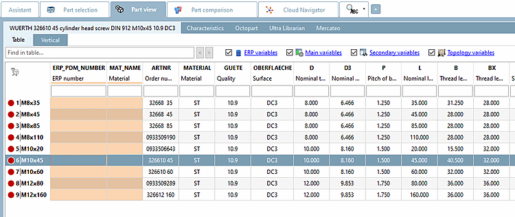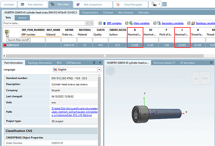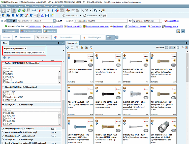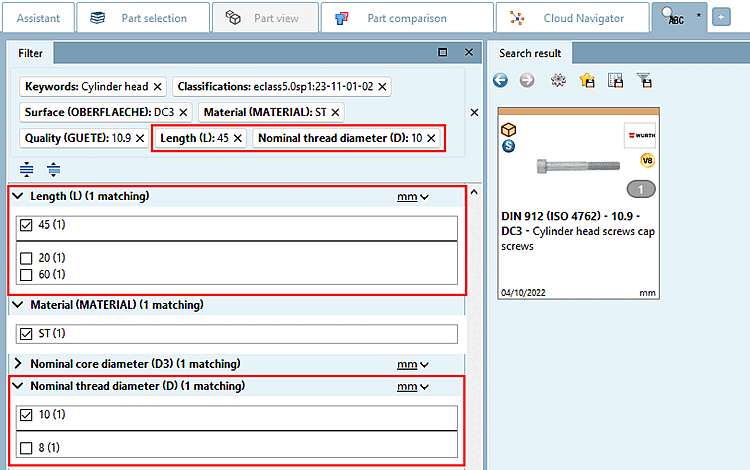 -> The more you specify the more variable filters are displayed (at screws e.g. nominal thread diameter and length, etc.).