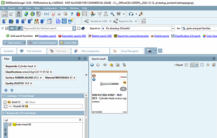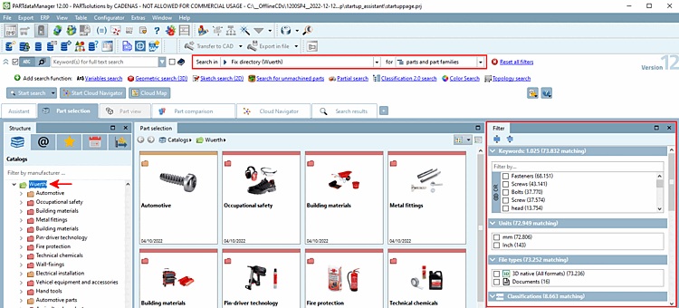 -> Current catalog (Würth) is displayed under Search in.