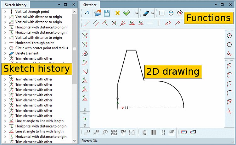 The two illustrations above show the default view once with 3D history [3D History] and once with sketch history [Sketch history] and Sketcher.
