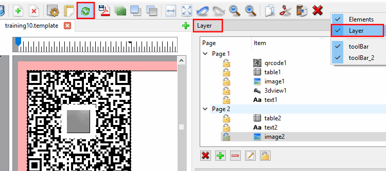 By clicking on the icons in the toolbar or on the plus/minus icons on the Layer tab page, the layer of the selected object can be moved forwards or backwards. The higher the entry in the list on the Layer tab page, the further forward the layer of the element is.