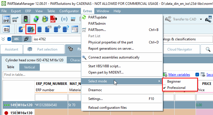 The desired mode is selected in PARTdataManager under Extras menu [Extras] -> Select mode. The default mode is defined in $CADENAS_DEFAULTUSER/partsolu.cfg -> Block [TWEAKMENU] -> Key "PARTdataManager_Mode" or "PARTproject_Mode". If the ModePreferences key is set to true in the relevant block, the corresponding menu item is displayed.