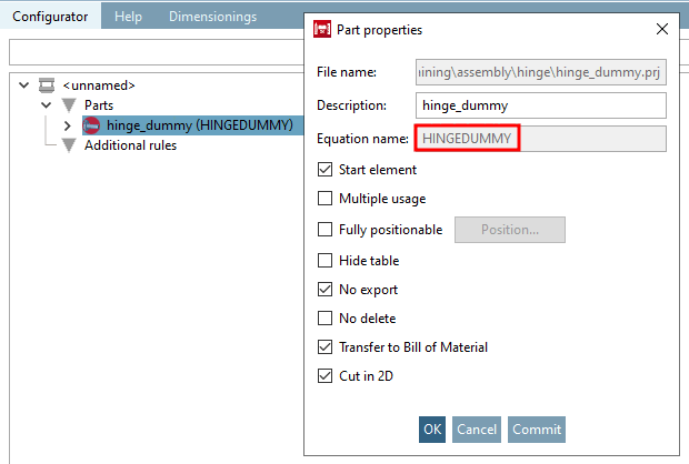 To add parts to a configuration, call up the context menu command Insert part [Add Part] above the Parts element.