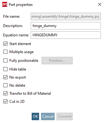 Cut in 2D: ... defines whether the part should also be affected when cutting in 2D. Remove the check mark, for example, for screws that you do not want to have hatched when cutting.