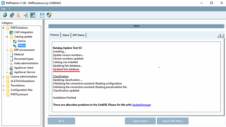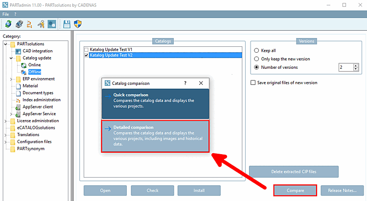 Under PARTadmin -> Category "Catalog update [Catalog update] " -> "Offline [Offline] " -> "Compare [Compare] " you can see a catalog comparison [Catalog comparison] with display of the directory structure and table. Changes to the directory structure are immediately visible.