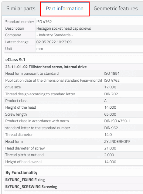 The part information contains standard information such as standard number, description, company and, if applicable, classification features (according to the installed classifications).