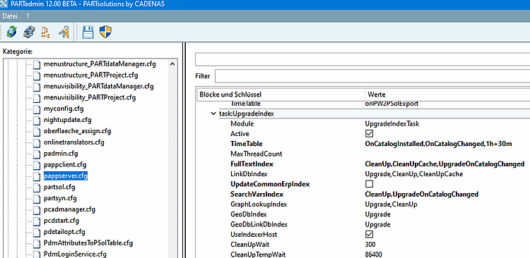 The UpgradeIndex task is generally used to update search indexes in the background. For parallel operation of V11 and V12, it is used to update the full text search index and the search index for variables when a catalog changes. To do this, the OnCatalogChanged trigger must be added to the TimeTable and the UpgradeOnCatalogChanged trigger must be added for the FullTextIndex and the SearchVarsIndex.