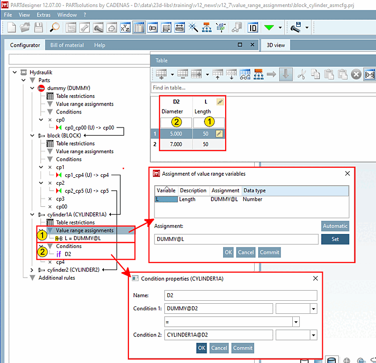 The assignments are made in the Configurator docking window in the Value range assignments dialog area. Although they can be made manually, using the automatic assignment function saves a lot of time. A significant amount of time can be saved just by assigning the value range variables from the "dummy" component.