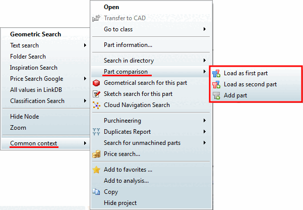 In the Cloud Navigator search [Cloud Navigation Search], you can access the component comparison in the context menu via General context [Common context] -> Component comparison [Part comparison].