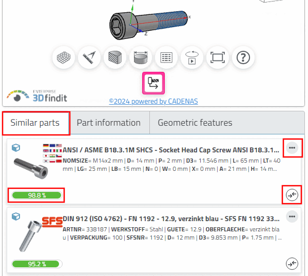 In the Similar parts dialog area, the parts similar to the loaded part are automatically listed with a percentage similarity.