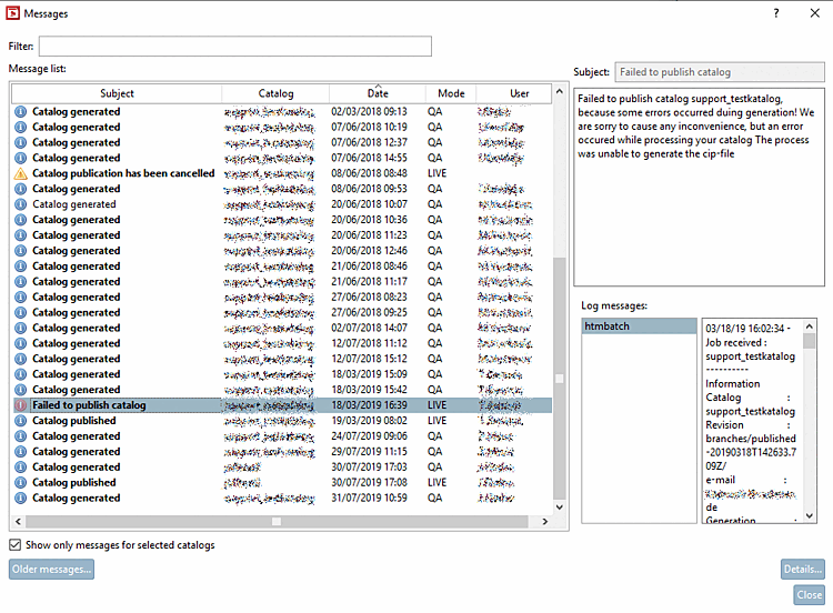 Make sure that the Show messages for all catalogs option is deactivated. If this checkbox is activated, the activation status of the checkboxes in the list is ignored.