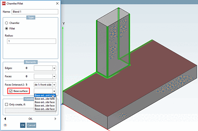 Only those edges that are adjacent to the base surface are rounded (or chamfered). In contrast to the application without a base surface (see above), the vertical edges on the small cuboid, for example, are not rounded.
