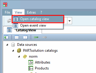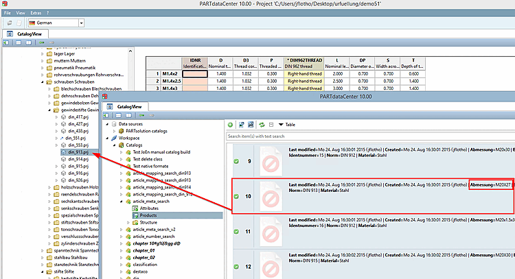 -> The tab page opens as a separate window. Position the two windows. Open the data records of the CSV file in one (Workspace [Workspace] -> CSV catalog name (self-assigned) -> Products ) and the corresponding project of the PARTsolutions catalog in the other (Data sources [Data sources] -> PARTsolutions Catalogs [PARTsolutions catalogs] -> Catalog -> Structure -> Directory -> Project).