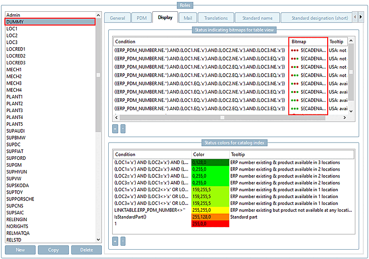 -> Here you can see various entries in the dialog areas Status bitmaps for table and Status colors for catalog index.