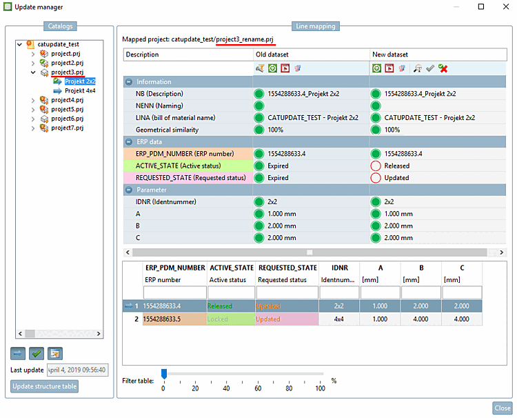 If projects or rows are missing in the new version, you can recognize this by an empty column under New data record [New dataset].